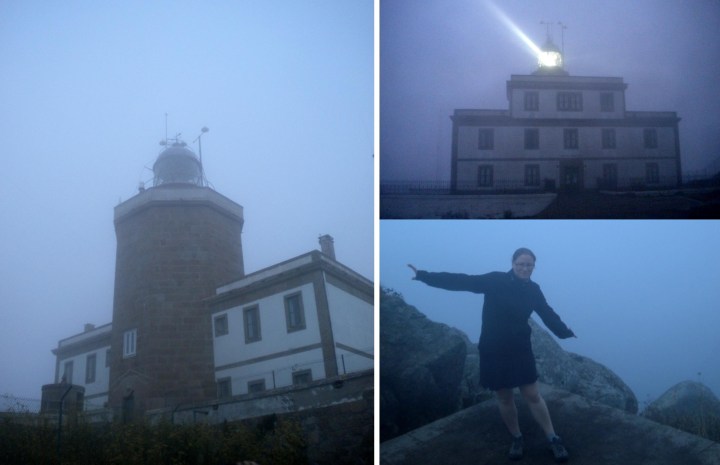 Y un estirón más (en bus, eso sí) y llegamos a Finisterre (o Fisterra como lo llaman allí). Es momento de cambiar el chip, de relajarse y respirar… Una playa prácticamente vacía com miles de conchas para coleccionar, agua helada para purificar el cuerpo, más lugareños y turistas que consiguen hacerte sonreir y reír y… el Faro. Decepción por no poder ver mi ansiada puesta de sol, pero magia envuelta de niebla: el Fin del Mundo, con todas sus letras. Nada más allá de la última roca. No hay mar. No se puede jugar a divisar América. Ahora sí, una tenue luz que alumbra la nada y miles de misterios por resolver, de historias que inventar…